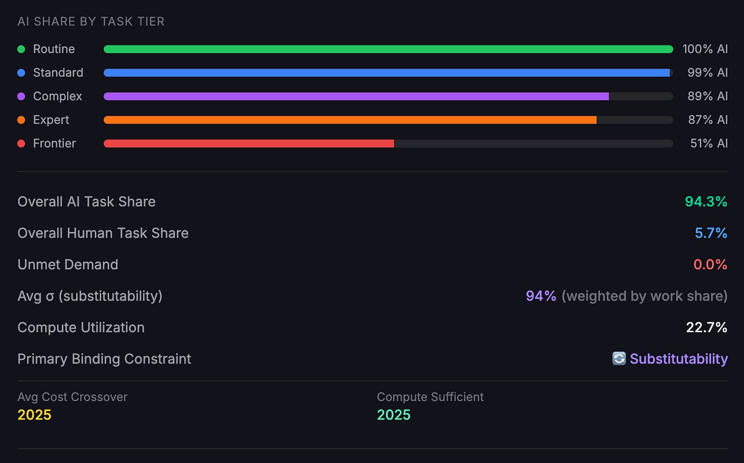 By 2040, human employment is much lower, though frontier tasks are still fully human due to compute costs.10