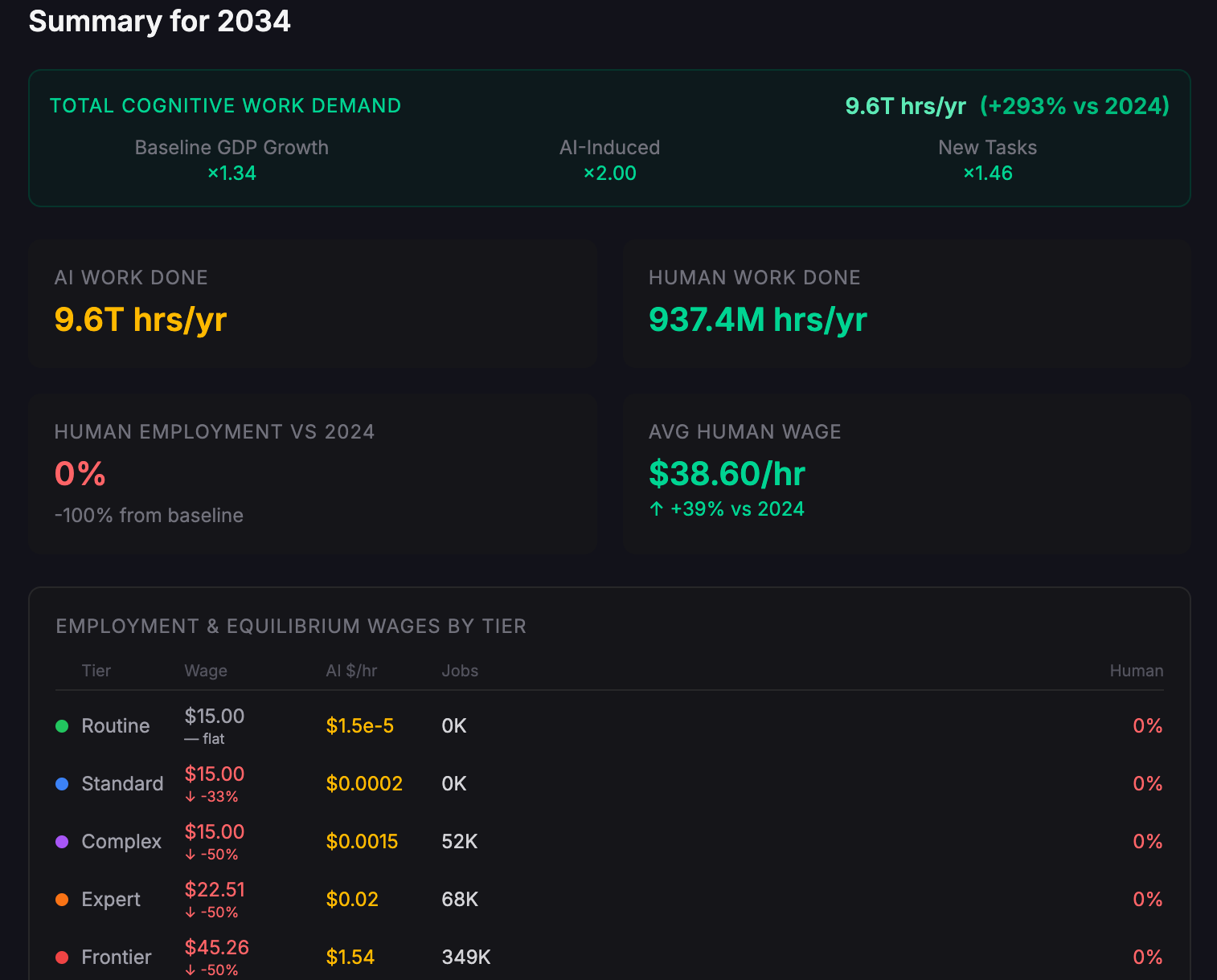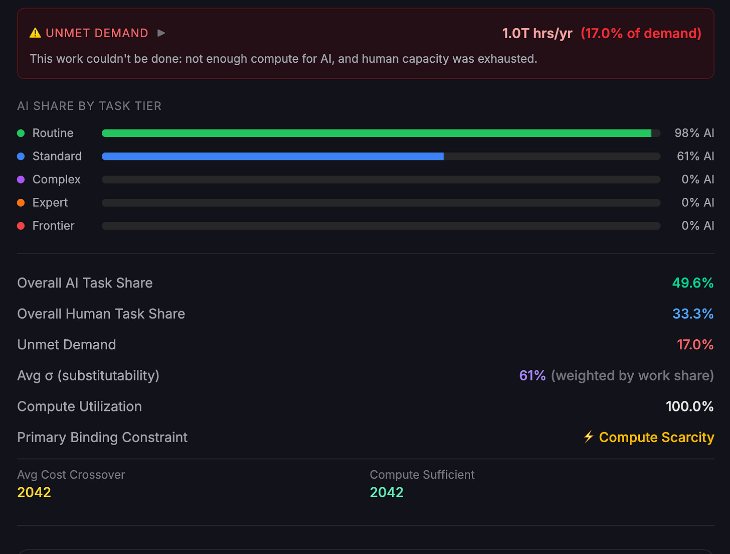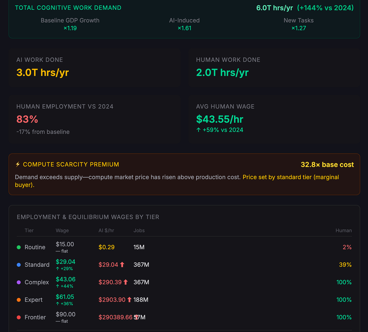 To explore this question, I have built a tool for modelling the effects of AI on the labour market. This tool makes some basic assumptions and simplifications about the labour market, and allows the user to play around with expectations about AI capabilities and speed of adoption, compute costs and availability, and economic questions about the amount of induced demand there will be due to greater capabilities, and get estimates of how that would affect human employment in cognitive tasks1.