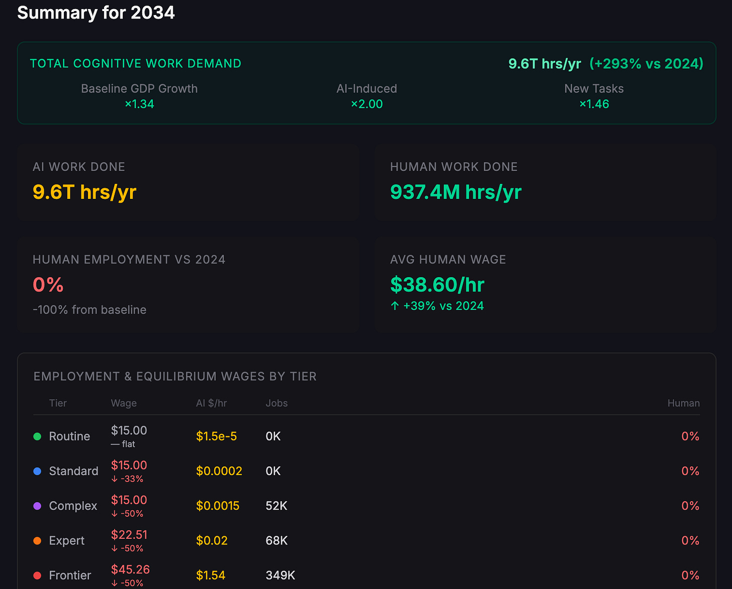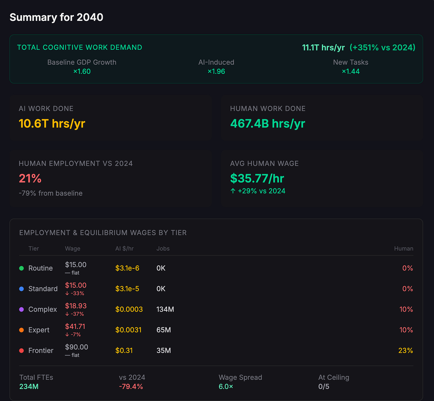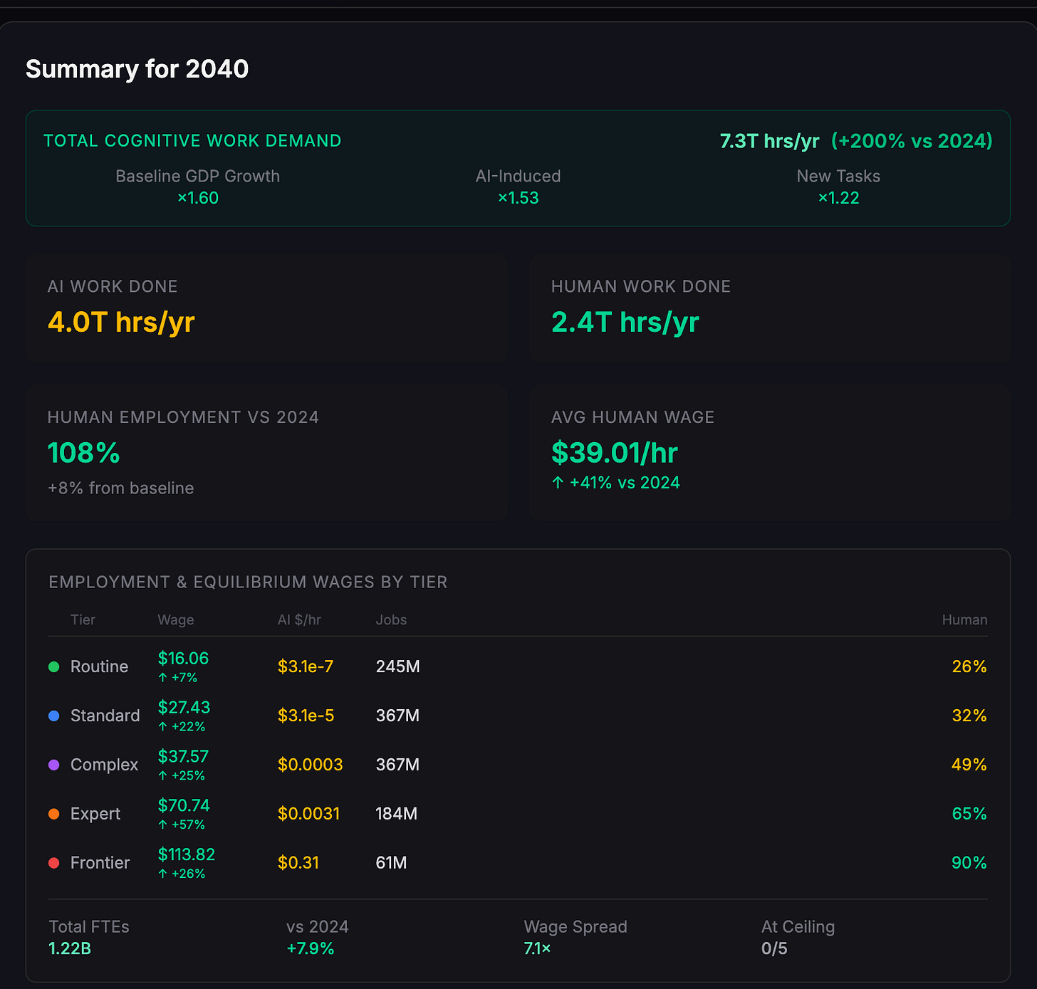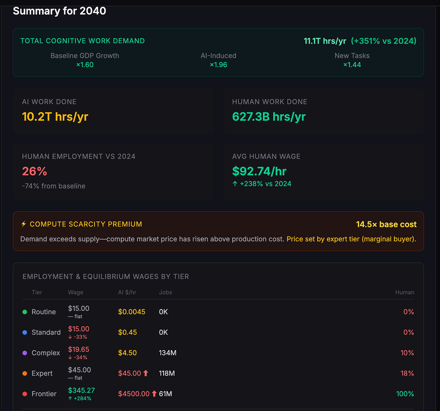 By 2040, humans are no longer competitive for simple tasks, and total work done has jumped by a factor of 4.5, but not enough to induce enough demand to keep wages high for those jobs that humans still have an advantage in.