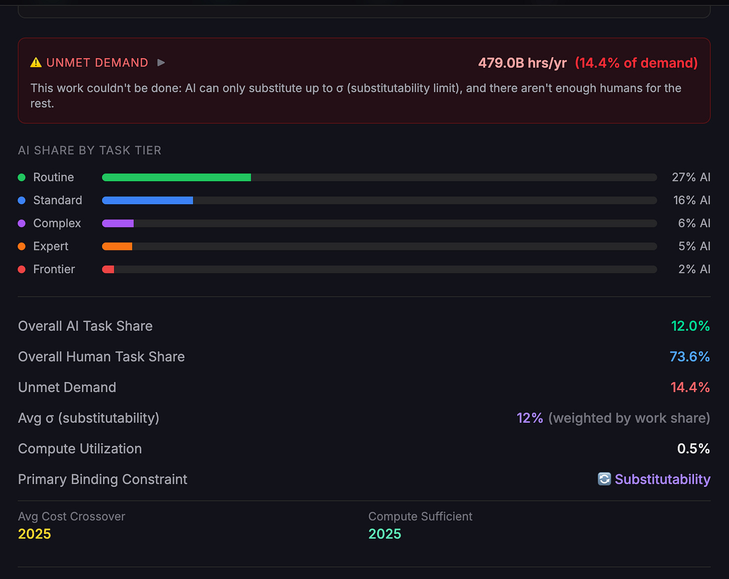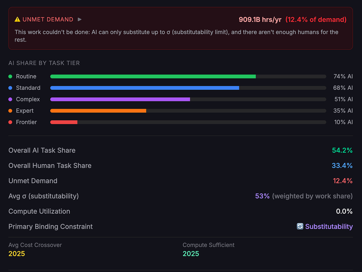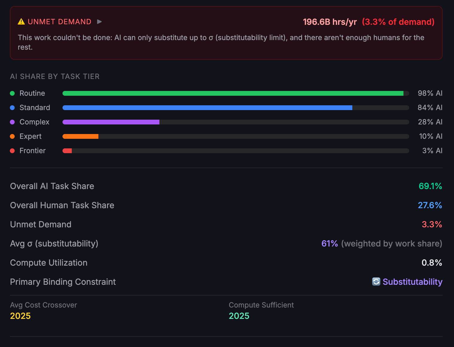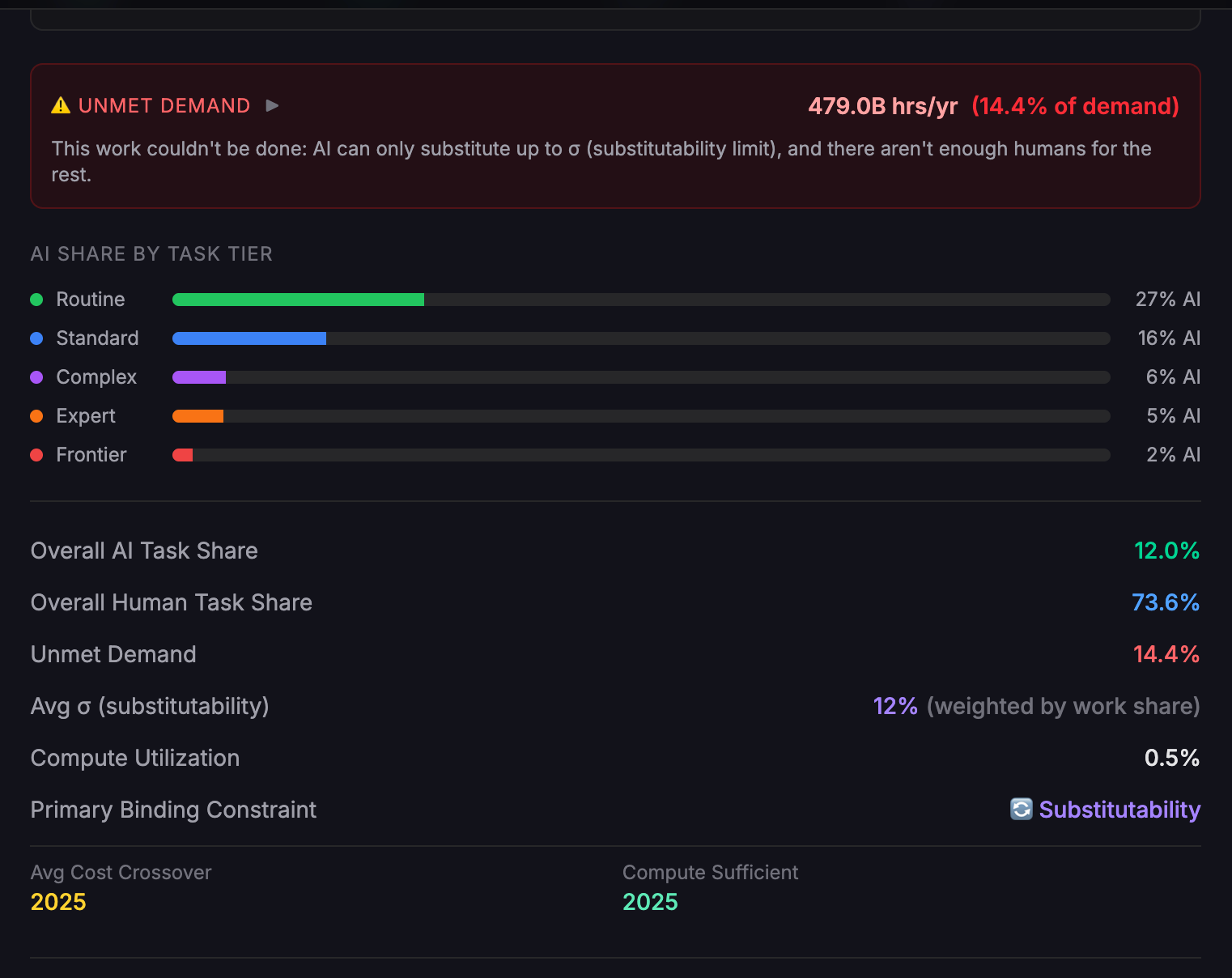 The model implicitly assumes something like perfect substitution for human and AI labour within the portion of tasks modelled as achievable for AI. That is, if an AI can do a task for less than a human can, there is no reason to employ a human also2.