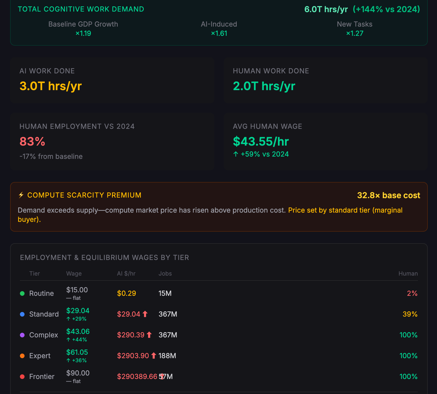 In 2030, wages are pushed up dramatically for most labour, but routine work is automated. Compute prices spike above production costs by a factor of 32 (making humans cost competitive at standard tier tasks).