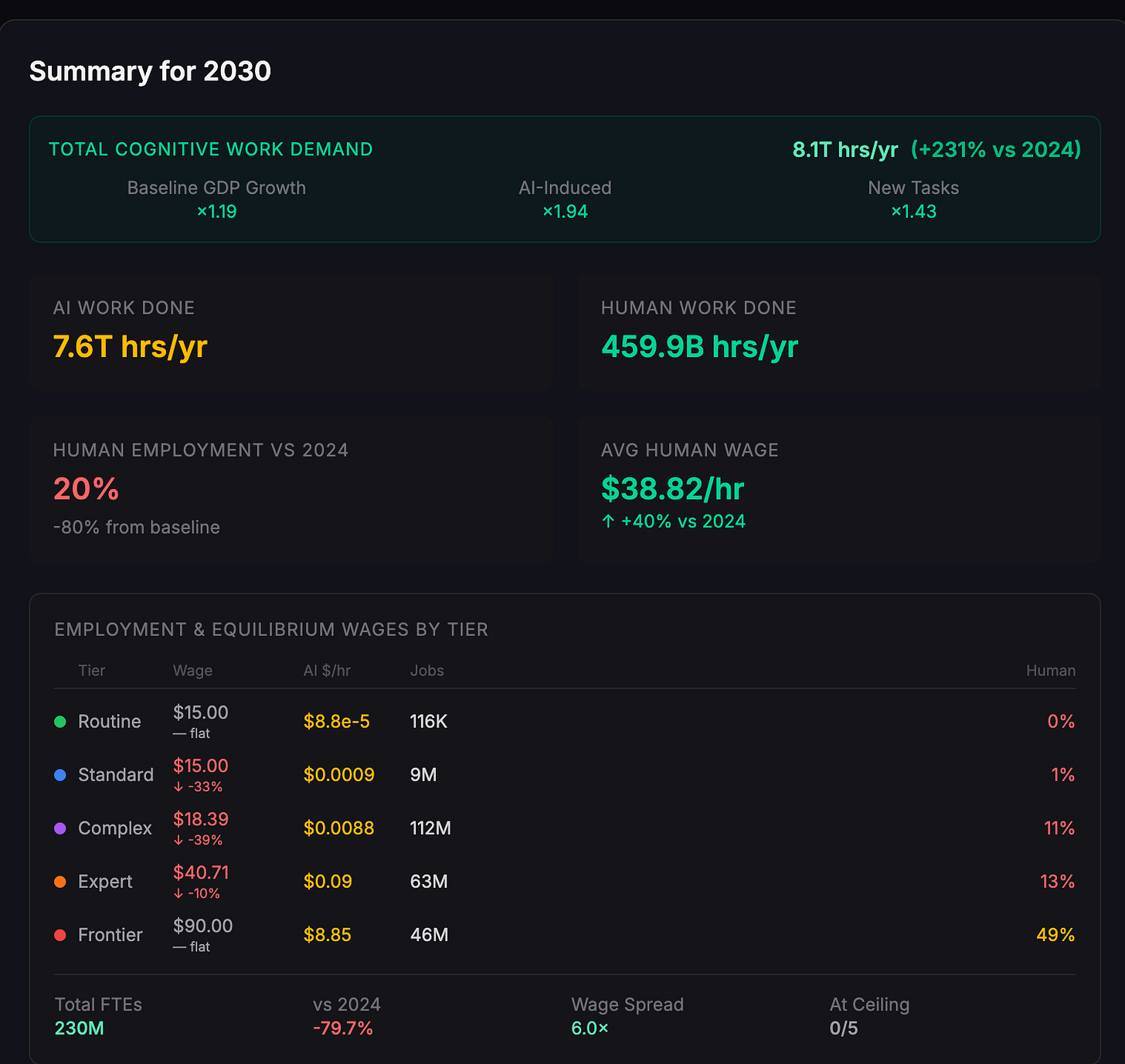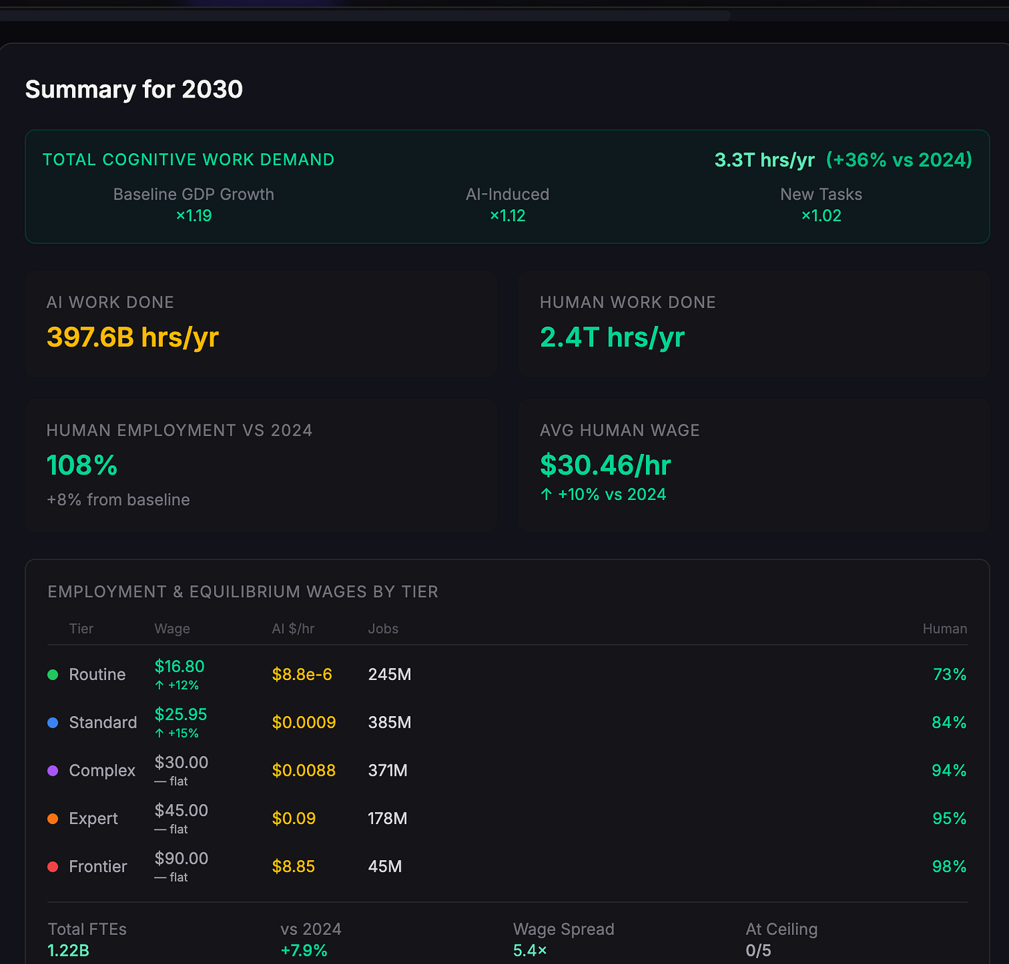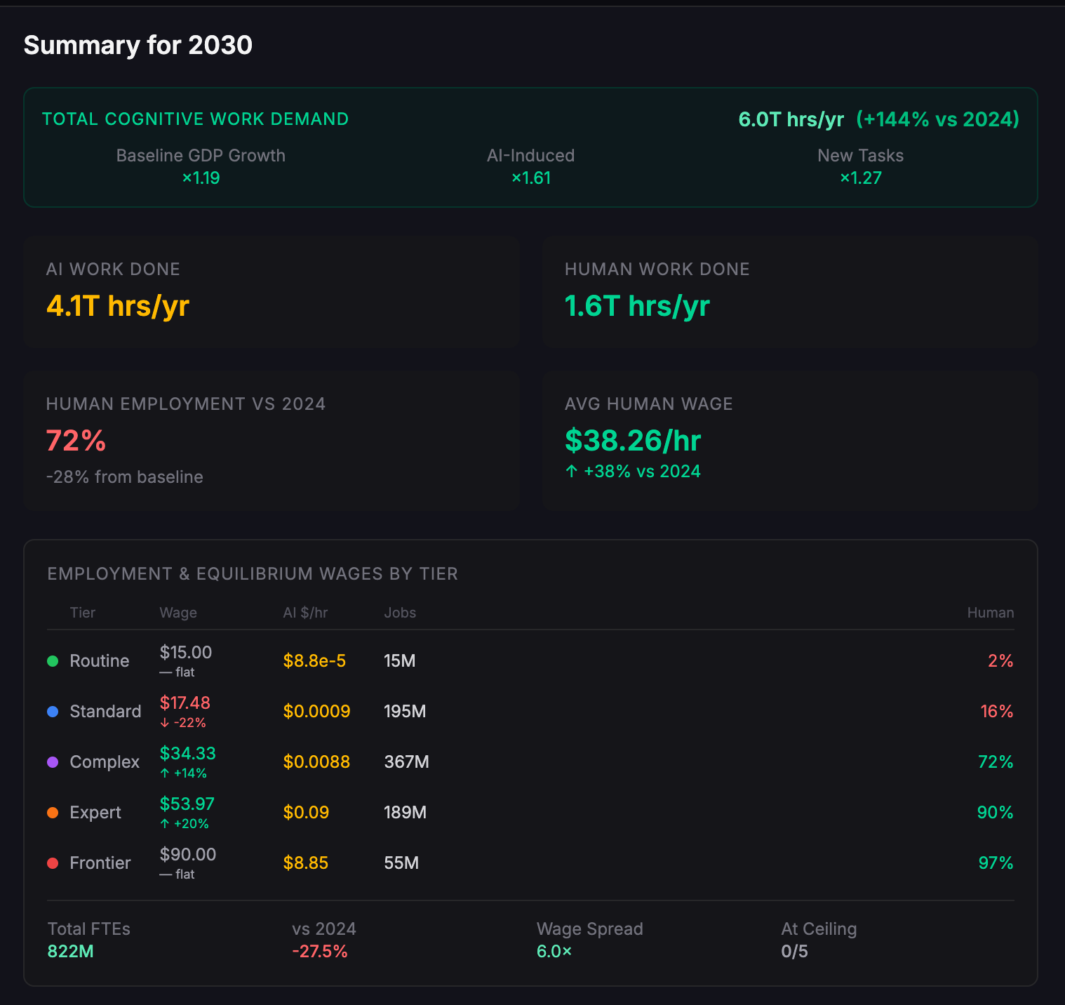 In 2030, there is significant wage pressure on lower tier work, and disemployment (employment is down 28% from baseline). For higher tier tasks wages have actually risen as AI induced demand boosts wages. Total work done has exploded. Compute has not been a limiting factor - if the compute is being used, it is for something else.