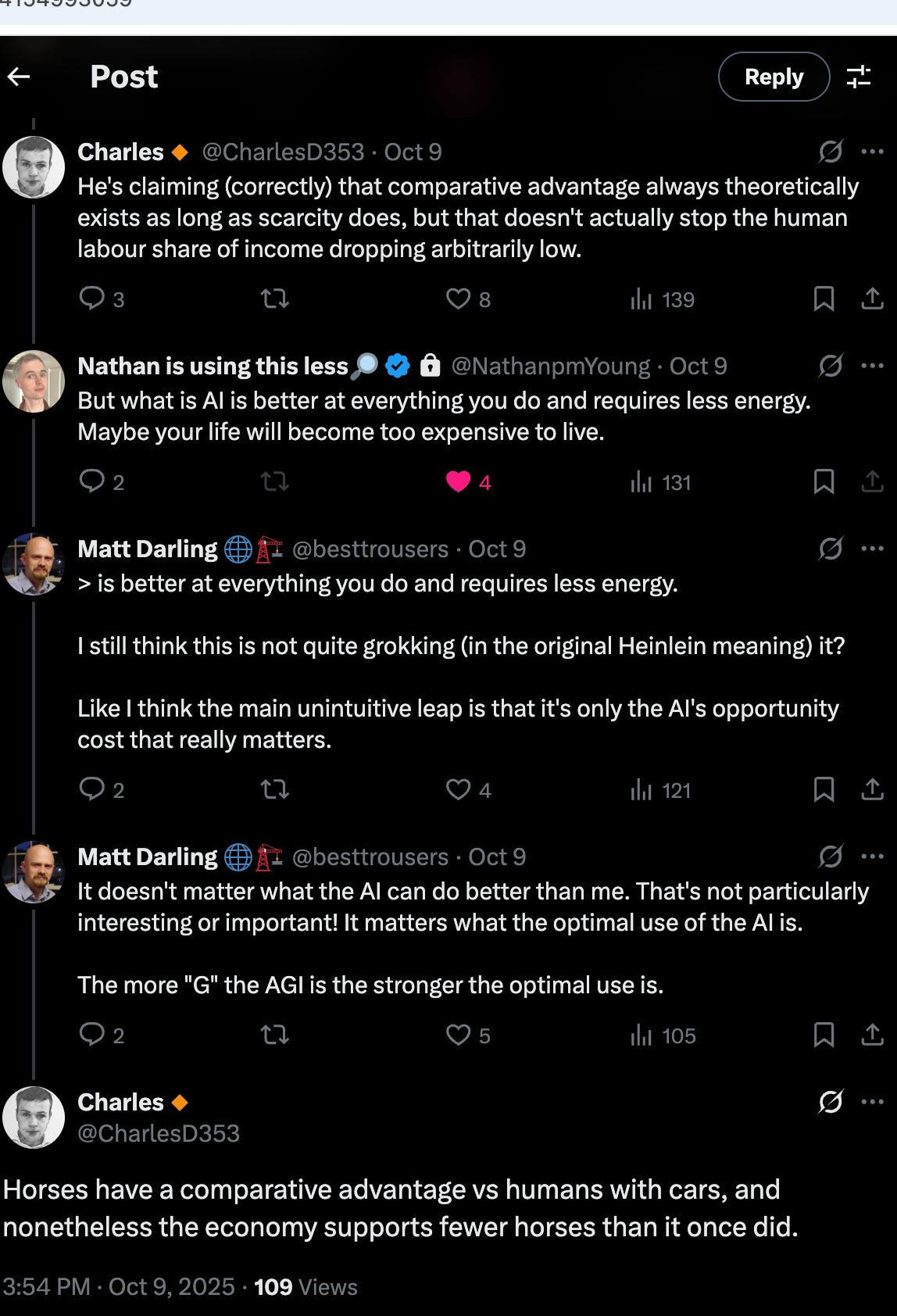 Naturally whether AI can fully replace everything is a point of contention - in particular there is a question of whether or not there are some things AI will never be able to do as well as a human, due to some humans having preferences for having humans do them, such as entertainment, professional sports, and companionship, among many examples. But just as we still keep horses around for largely entertainment purposes and yet have far fewer horses2 than we did before the invention of the automobile, there is no iron law of economics which ensures there has to be as many jobs for humans as there are humans who’d like jobs, or that they will pay above a threshold. There might be new jobs, but they are not ensured by the principle of comparative advantage alone.