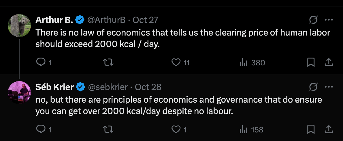 He does, in a response under the post, acknowledge that this is not sufficient to ensure human flourishing and we must rely on other mechanisms for that.